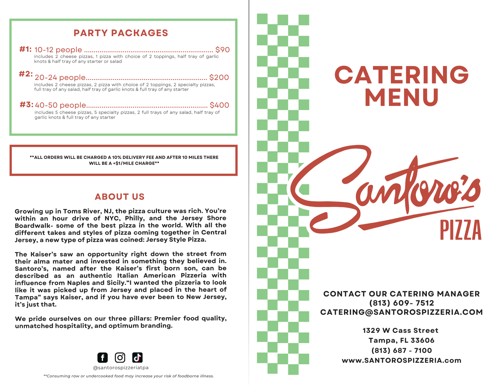 You can call or text us at (813) 609 - 7512 or email us directly at catering@santorospizzeria.com, and one of us will reach out to you as soon as possible!
